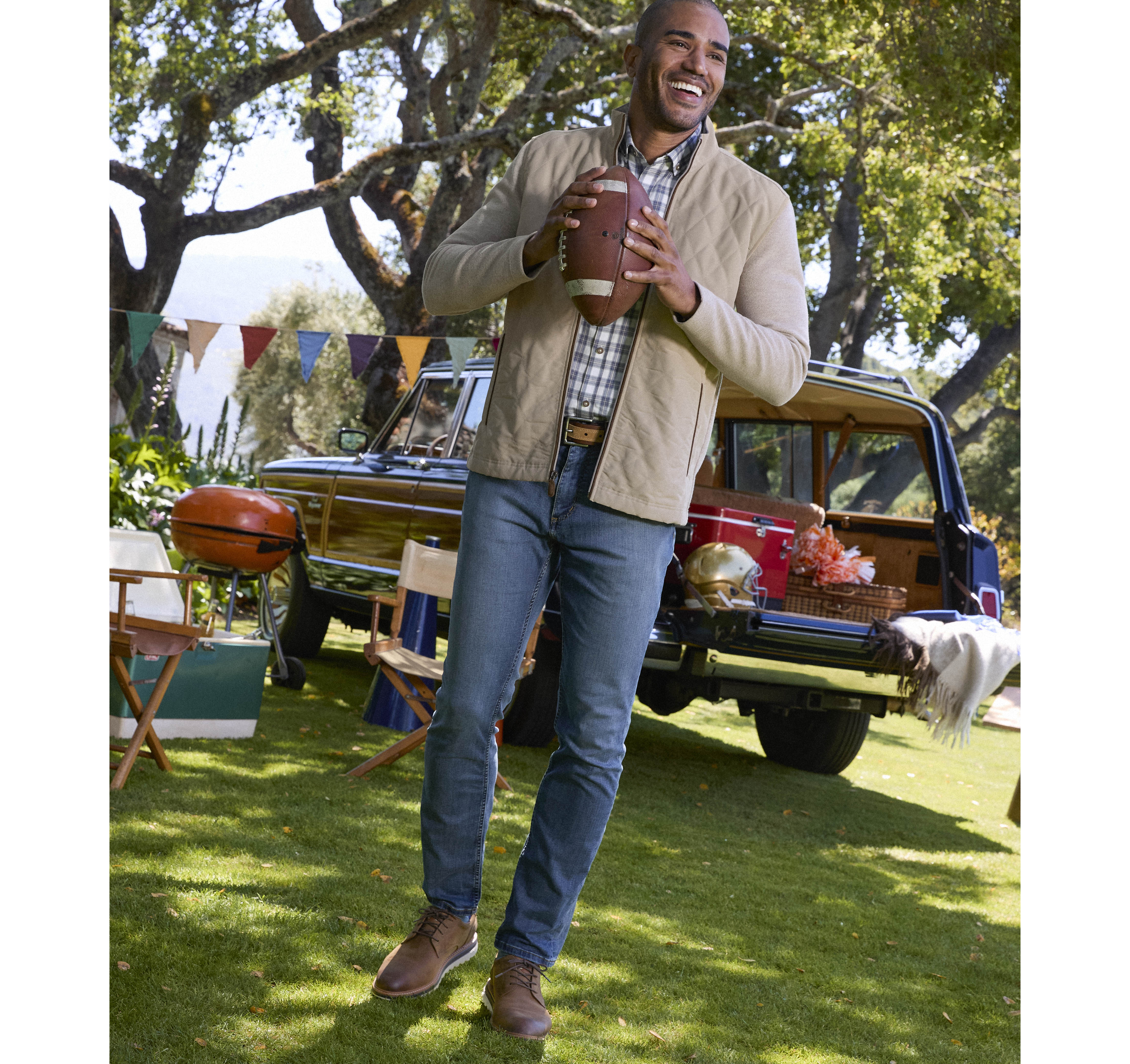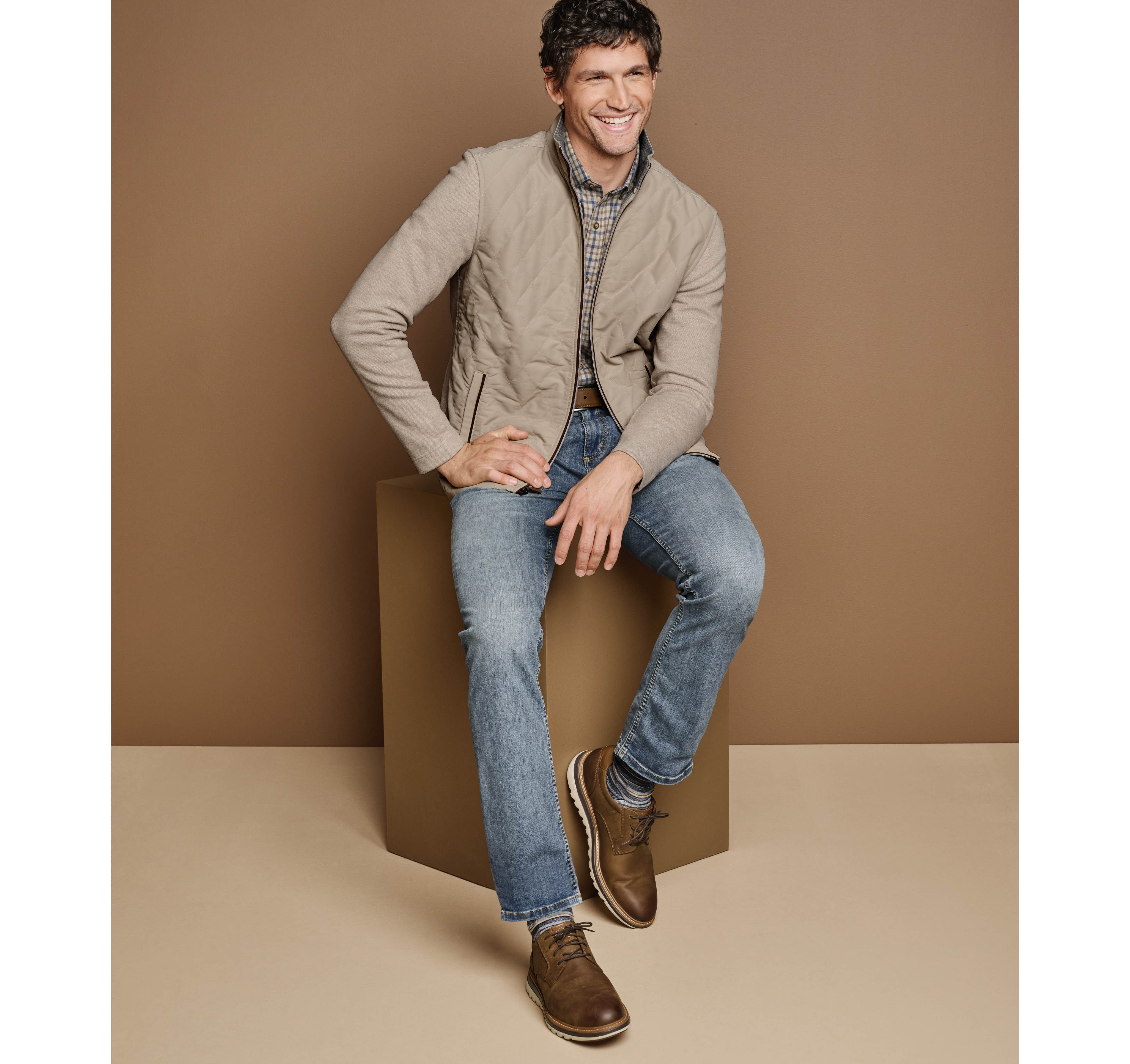 • Artfully combines diamond-quilted woven front panels with soft, heathered knit sleeves and back.