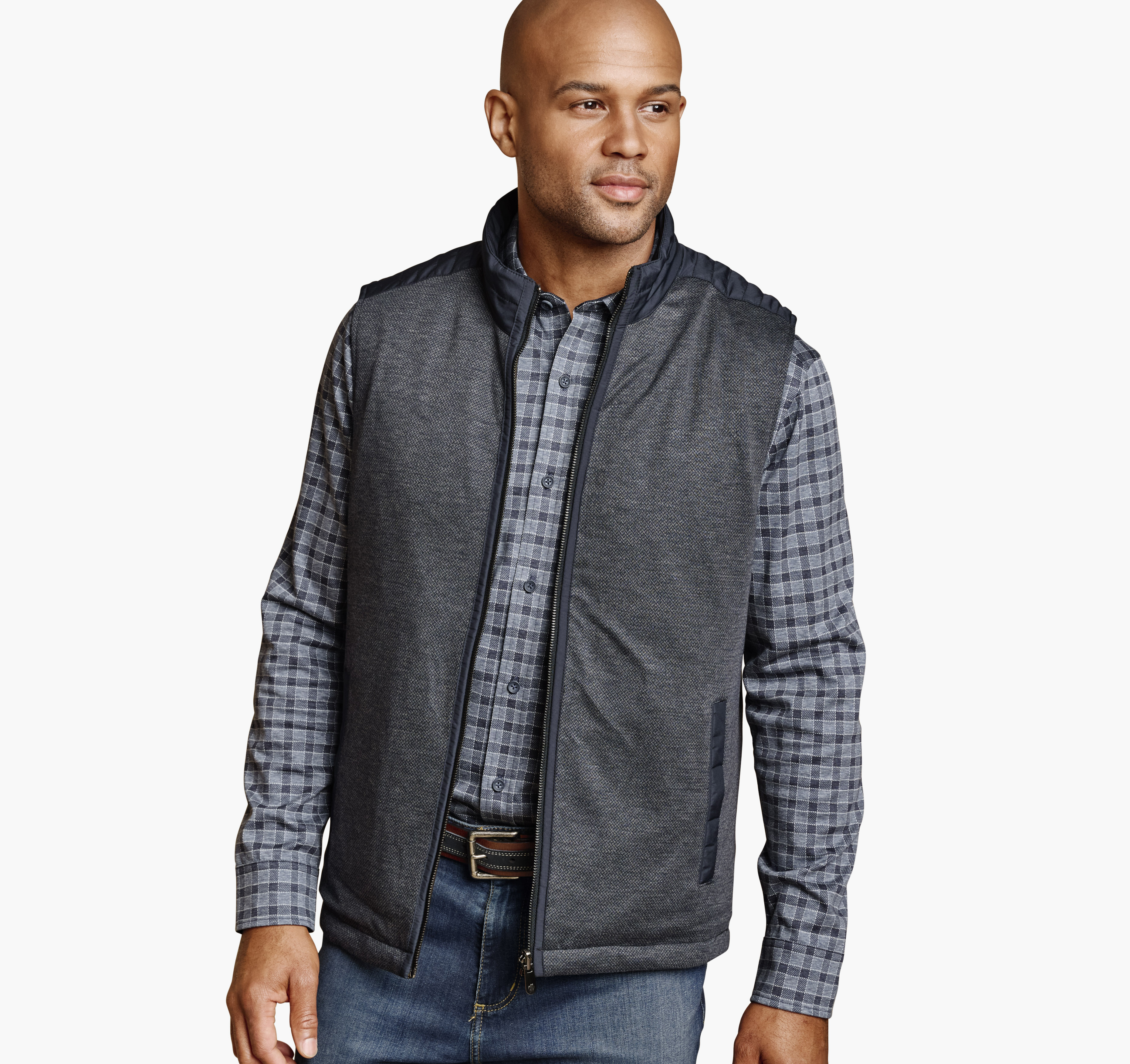 • Channel-quilted woven side reverses to a tweedy stretch knit.