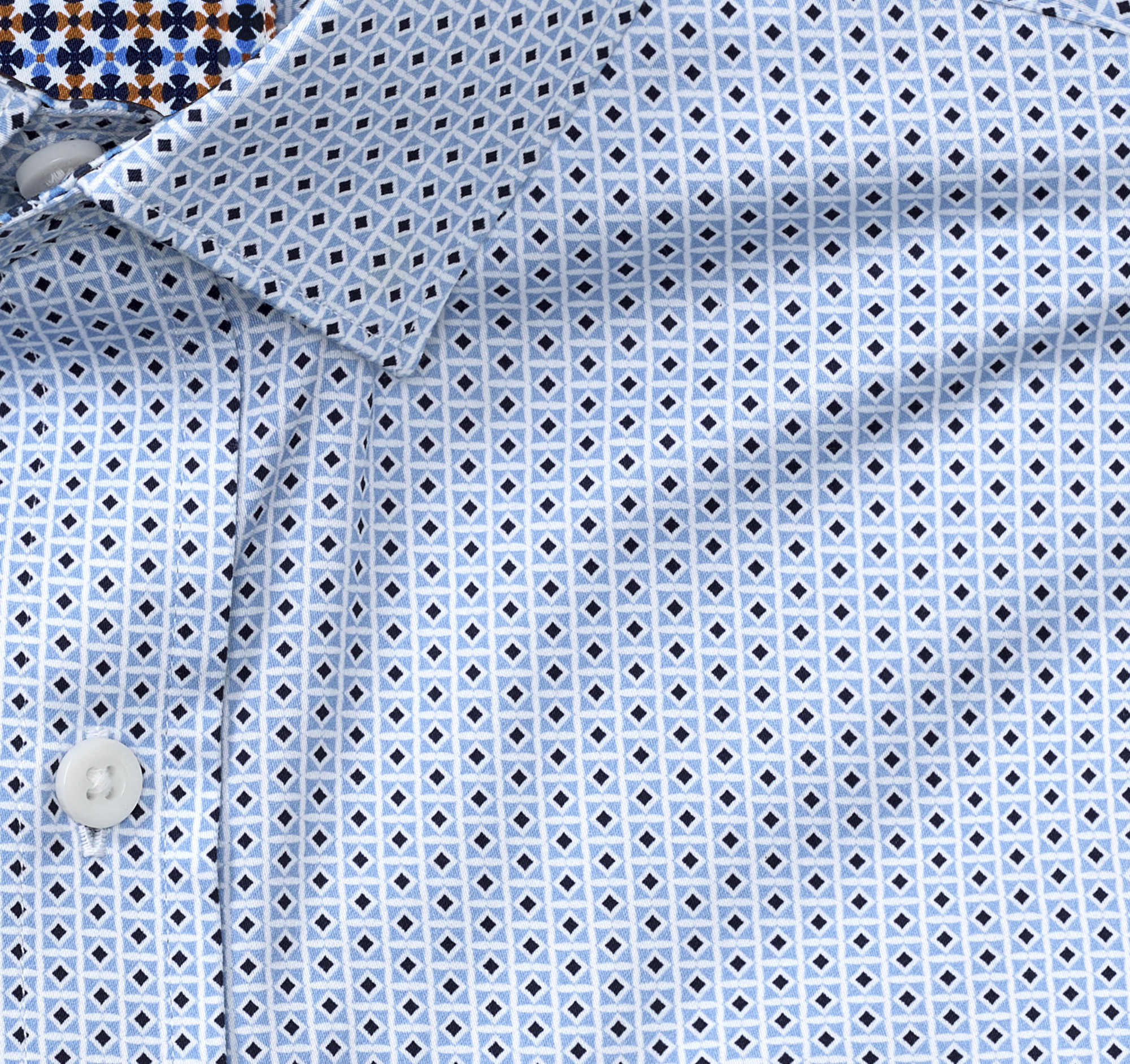 - Point collar with hidden buttons for stay-in-place neatness.