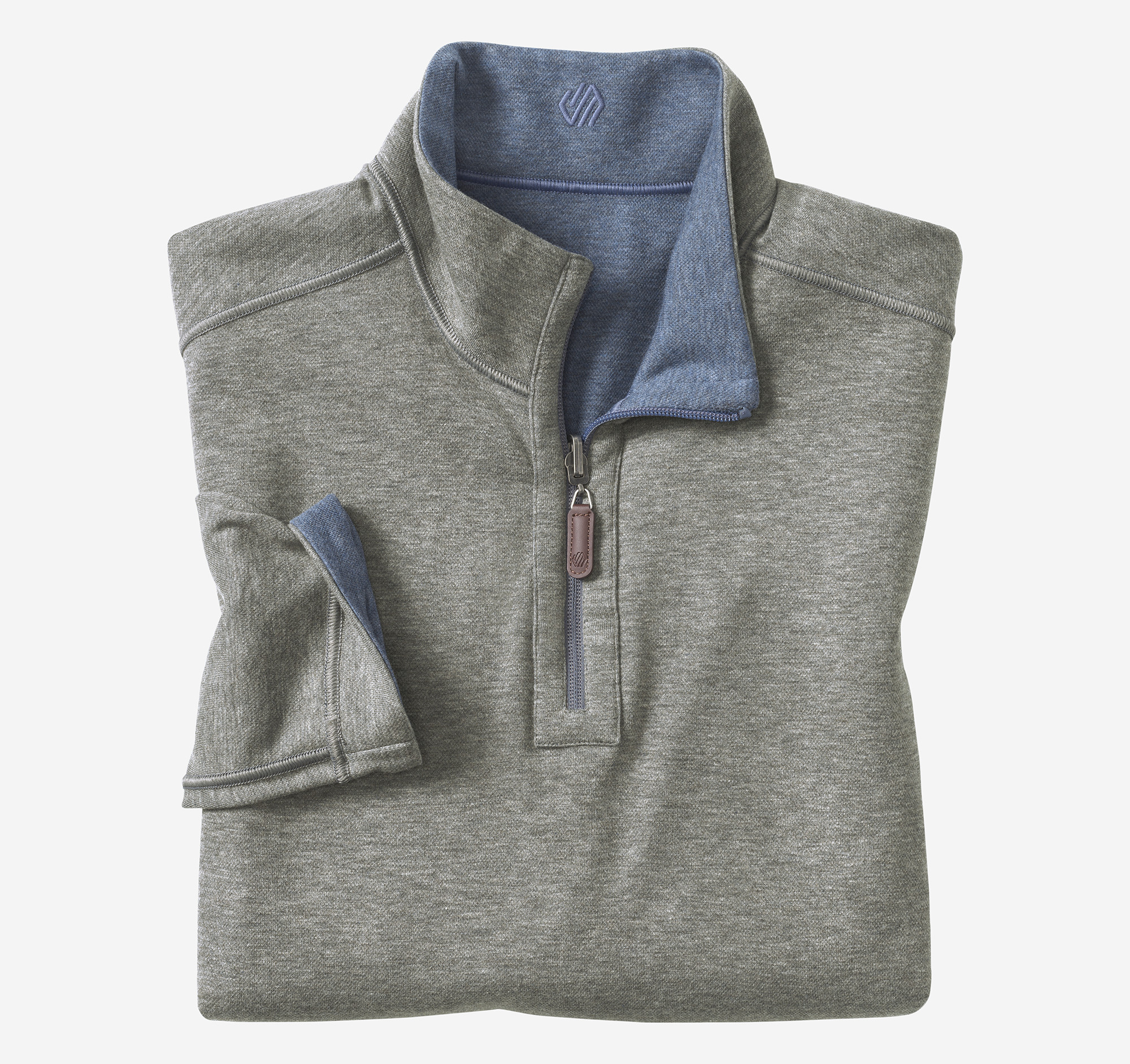 • Quarter-zip placket with logo leather-look pull.