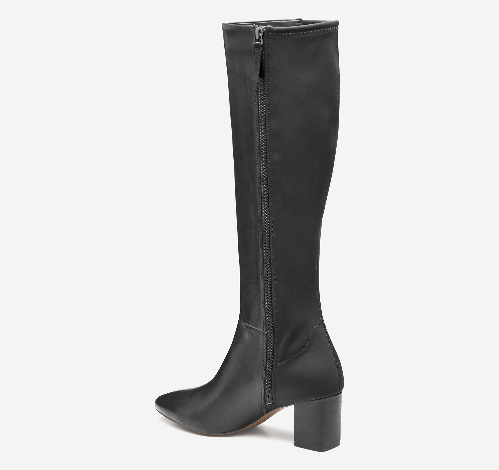 - Buttery calfskin with a stretchy spandex back for comfort and a perfect, calf-hugging fit.
